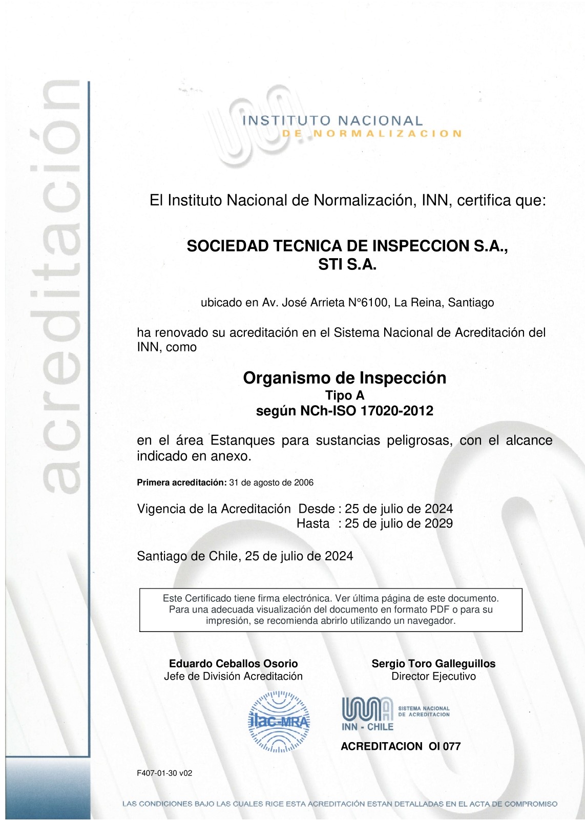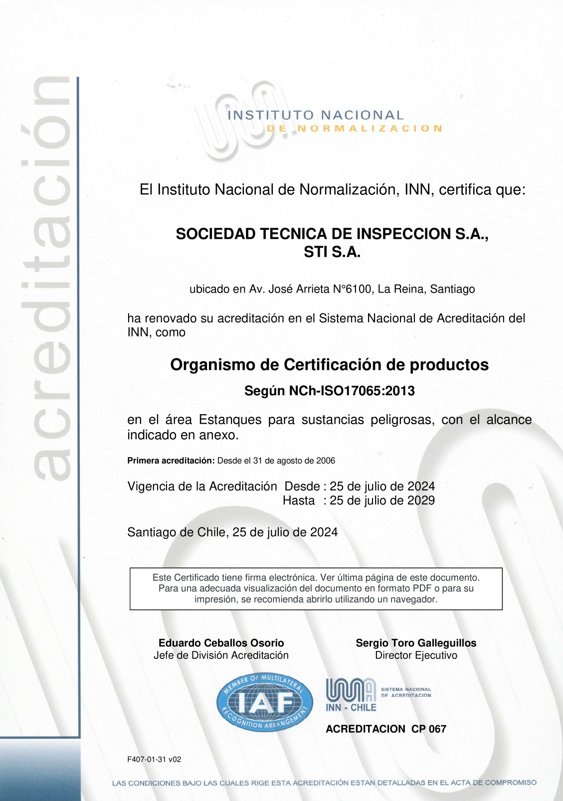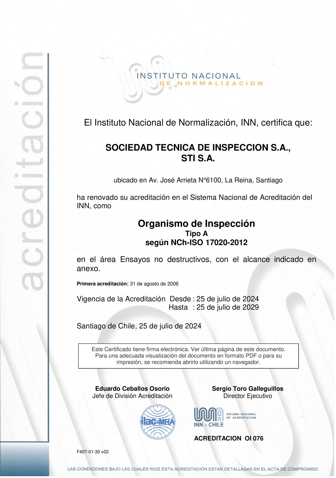 Con el objetivo de poder garantizar la calidad de los servicios, Sociedad Técnica de Inspección S.A. (STI S.A.), desde el año 2000, cuenta con la acreditación del Instituto Nacional de Normalización (INN), como Organismo de Certificación de Productos y Organismo de Inspección, de acuerdo a las normas NCh-ISO17065 y NCh-ISO17020 respectivamente, lo que permite un alto grado de competencia. Desde su inicio, STI S.A. cuenta con un importante staff de profesionales calificados y técnicos de alto nivel, los que a través de una capacitación permanente, nos permite contar con inspectores niveles I y II en técnicas de ensayos no destructivos según la norma americana SNT-TC-1A 2006 de ASNT. Además, la reconocida experiencia en el área metalmecánica, ha permitido a STI S.A. formar parte de comisiones tanto de la SEC como del INN para la confección de protocolos y NCh para la certificación de productos en el área de los combustibles, gas licuado de petróleo y sustancias peligrosas.