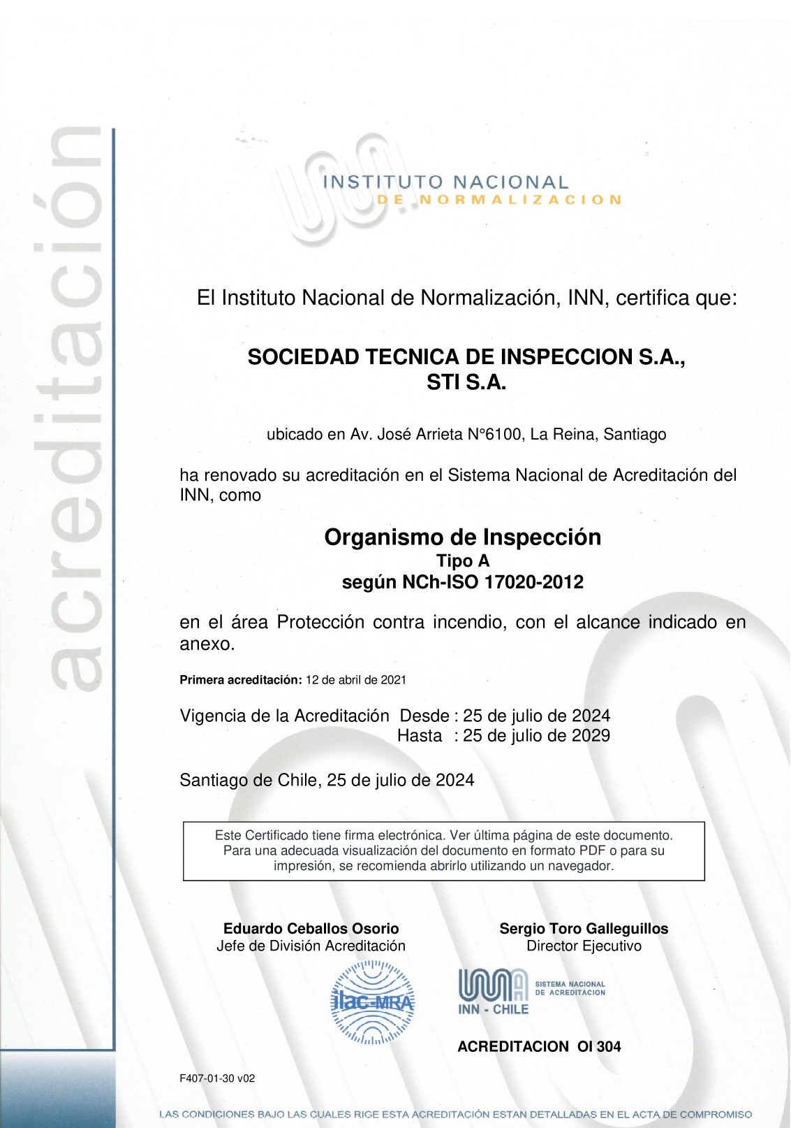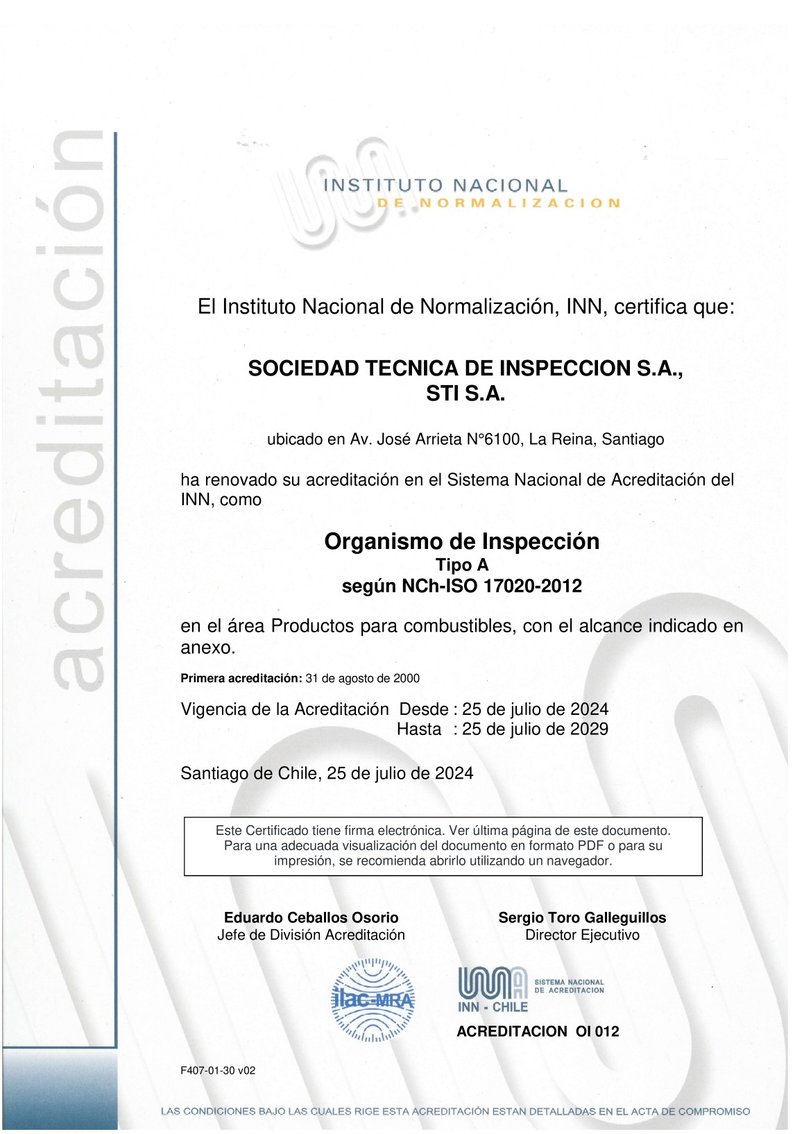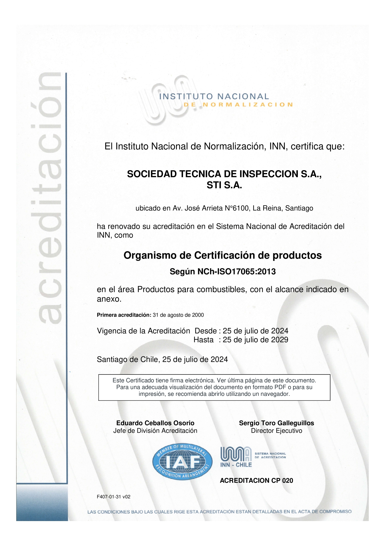 Con el objetivo de poder garantizar la calidad de los servicios, Sociedad Técnica de Inspección S.A. (STI S.A.), desde el año 2000, cuenta con la acreditación del Instituto Nacional de Normalización (INN), como Organismo de Certificación de Productos y Organismo de Inspección, de acuerdo a las normas NCh-ISO17065 y NCh-ISO17020 respectivamente, lo que permite un alto grado de competencia. Desde su inicio, STI S.A. cuenta con un importante staff de profesionales calificados y técnicos de alto nivel, los que a través de una capacitación permanente, nos permite contar con inspectores niveles I y II en técnicas de ensayos no destructivos según la norma americana SNT-TC-1A 2006 de ASNT. Además, la reconocida experiencia en el área metalmecánica, ha permitido a STI S.A. formar parte de comisiones tanto de la SEC como del INN para la confección de protocolos y NCh para la certificación de productos en el área de los combustibles, gas licuado de petróleo y sustancias peligrosas.