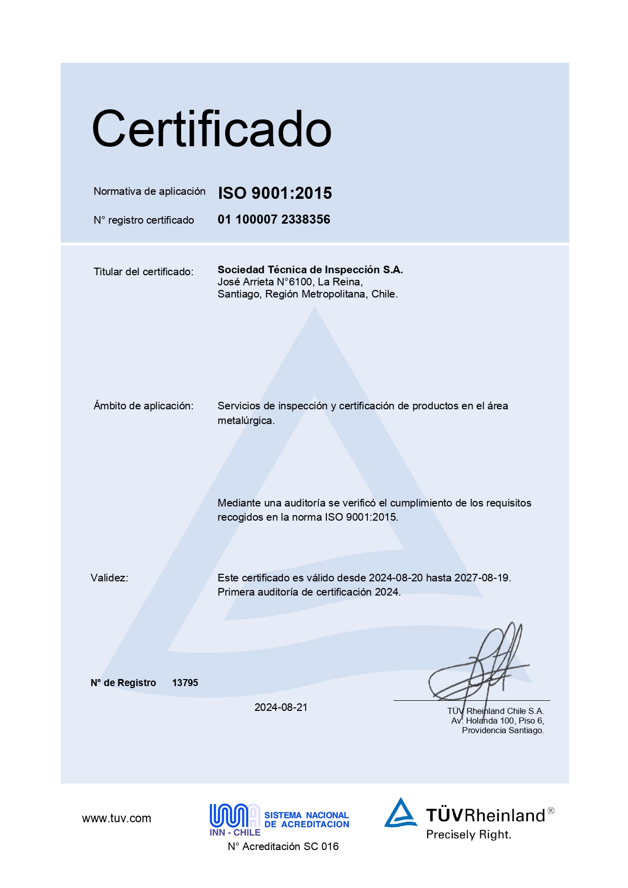 Sociedad Técnica de Inspección S.A. (STI S.A.), en su empeño de avanzar en nuestro compromiso de proporcionar continuamente servicios de inspección y certificación de productos en el área metalúrgica de excelente calidad, que satisfagan los requisitos del cliente, la mejora continua de nuestros procesos, con el respaldo de la competencia de nuestro personal y la satisfacción de nuestros clientes en la prestación de servicios. Cuenta con la certificación del Sistema de Gestión de la Calidad, bajo la norma ISO 9001:2015. Permitiendo así, consolidar aún más nuestras acreditaciones como Organismo de Inspección y Organismo de Certificación, bajo las normas NCh-ISO 17020 y NCh-ISO 17065.